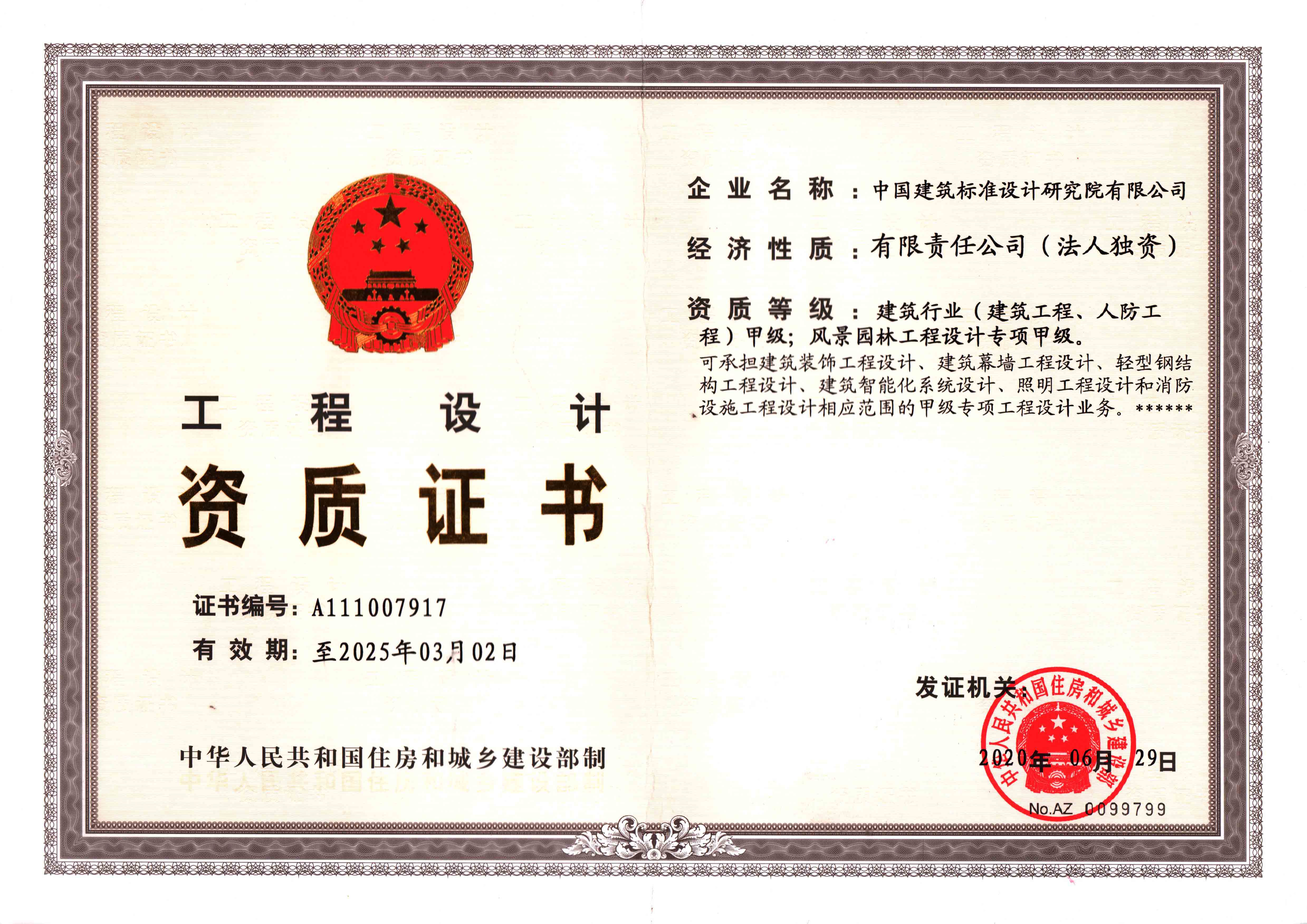 人防工程設(shè)計甲級資質(zhì)證書