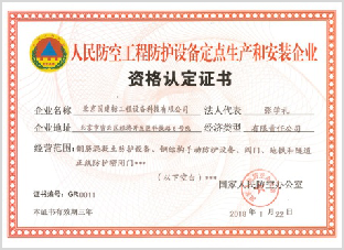 人防工程防護設(shè)備定點生產(chǎn)和安裝企業(yè)資格認定證書