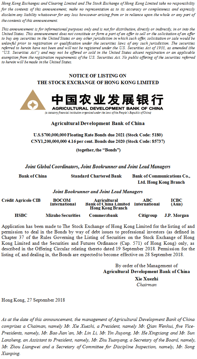 NOTICE OF LISTING ON THE STOCK EXCHANGE OF HONG KONG LIMITED