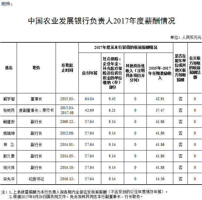 自2015年1月起,中國農(nóng)業(yè)發(fā)展銀行董事長、行長、紀委書記及其他副職負責人的薪酬,按照國家關(guān)于中央管理企業(yè)負責人薪酬制度改革的意見執(zhí)行。根據(jù)國家有關(guān)規(guī)定,現(xiàn)公開披露中國農(nóng)業(yè)發(fā)展銀行負責人2017年度薪酬。