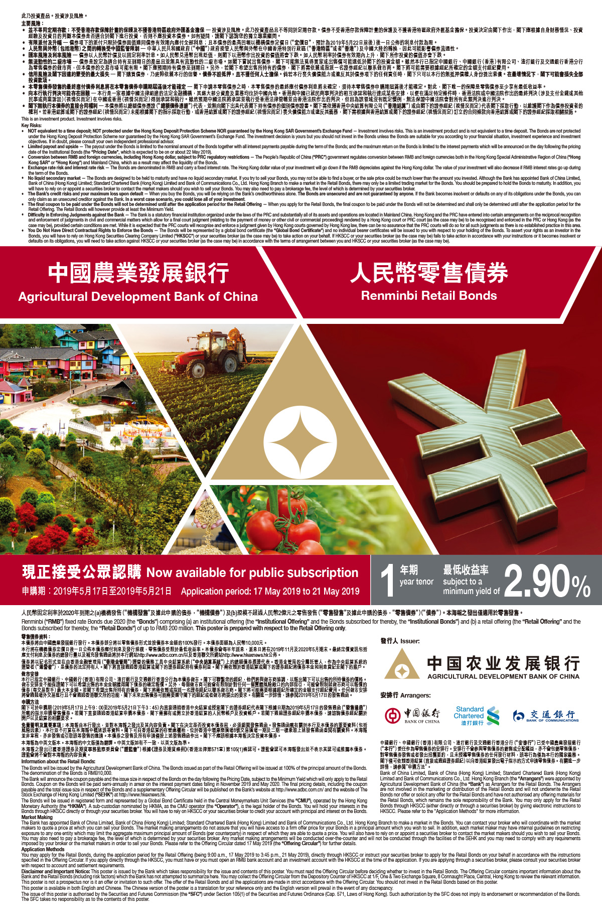 中國農(nóng)業(yè)發(fā)展銀行人民幣零售債券現(xiàn)正接受香港公眾認(rèn)購 AGRICULTURAL DEVELOPMENT BANK OF CHINA RENMINBI RETAIL BONDS - NOW AVAILABLE FOR HK PUBLIC SUBSCRIPTION
