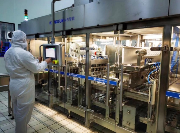 ▲工人操作全自動酸奶罐裝機罐裝酸奶