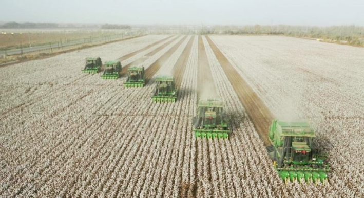 ▲巴州尉犁縣高標(biāo)準(zhǔn)棉田機(jī)械化收割場景