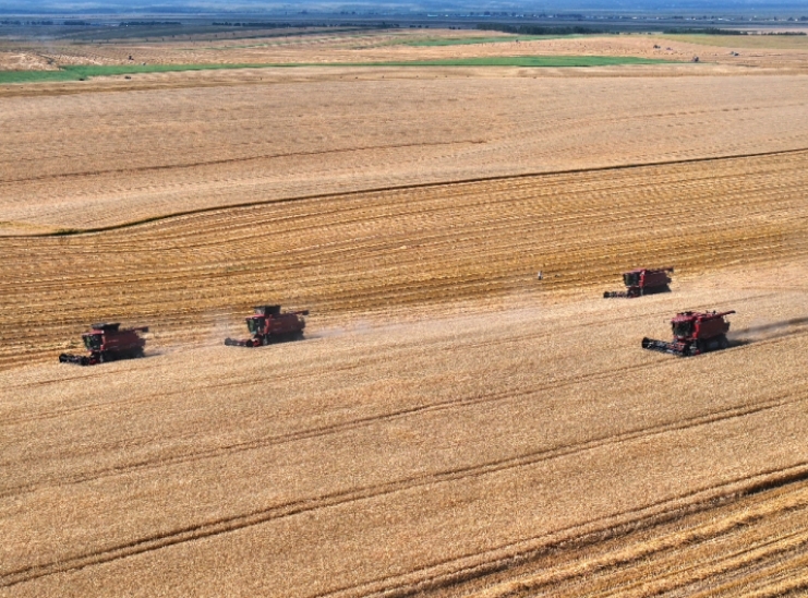 ▲伊犁昭蘇縣小麥機(jī)械化收割場景