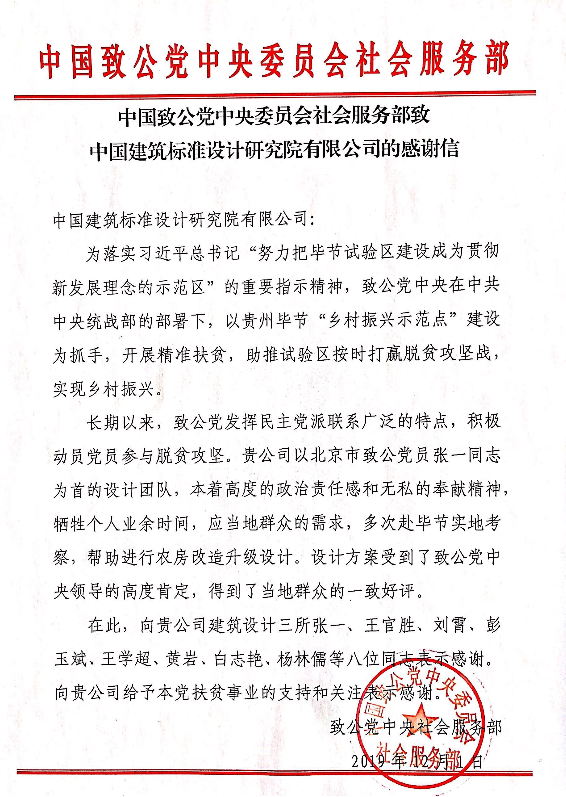 為積極落實(shí)中共中央打贏脫貧攻堅(jiān)戰(zhàn)的號(hào)召,標(biāo)準(zhǔn)院自發(fā)參與到貴州省畢節(jié)市七星關(guān)區(qū)的扶貧工作中來。2019年12月1日,在標(biāo)準(zhǔn)院建筑設(shè)計(jì)三所項(xiàng)目團(tuán)隊(duì)的共同努力下,標(biāo)準(zhǔn)院收到了中國(guó)致公黨中央委員會(huì)社會(huì)服務(wù)部發(fā)來的感謝信,感謝標(biāo)準(zhǔn)院和項(xiàng)目團(tuán)隊(duì)本著高度的政治責(zé)任感和無私的奉獻(xiàn)精神對(duì)于扶貧事業(yè)的支持和關(guān)注。
