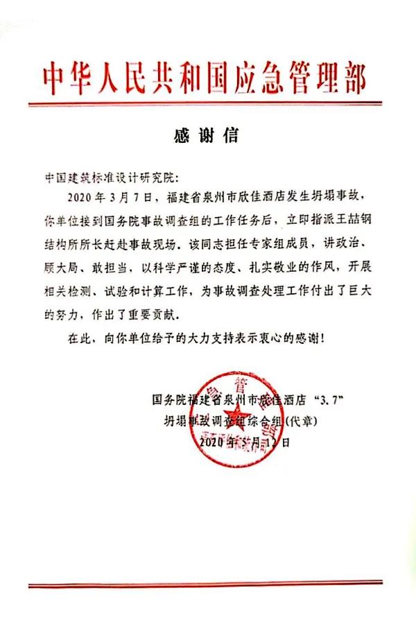 近日,中國建筑標準設(shè)計研究院有限公司(以下簡稱“標準院”)收到來自中華人民共和國應急管理部的感謝信,對標準院鋼結(jié)構(gòu)專家王喆參加國務(wù)院福建省泉州市欣佳酒店“3?7”坍塌事故調(diào)查工作表示感謝。