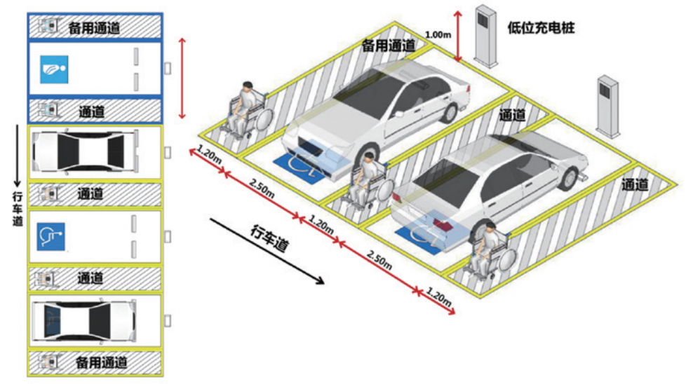 使用“N+1”停車位的設(shè)計(jì)理念,即N車位數(shù)+1通道數(shù),為不同停車方向下車的輪椅使用者提供方便。無障礙機(jī)動車停車位為藍(lán)色,孕婦停車位為黃色,與普通車位區(qū)分,并涂有停車線、輪椅通道線和無障礙標(biāo)志,配有低位充電樁。