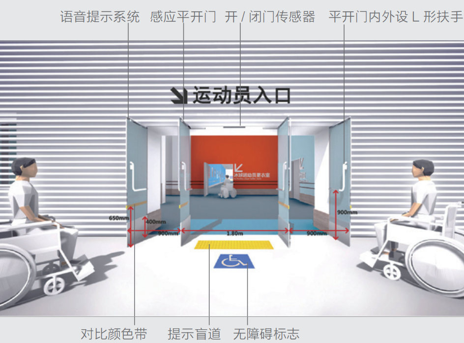 場館及綜合樓的出入口為無障礙平坡出入口,坡度為1:50,并設(shè)有遮陰避雨設(shè)施,地面平整、防滑。入口門為感應(yīng)平開門,通行凈寬雙扇1.8m不設(shè)置門檻,以保證輪椅通行。