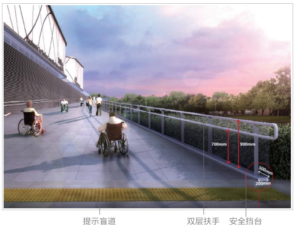 西側(cè)主坡道作為觀眾主入口,會有大量人群同時進(jìn)入,該坡道縱向坡度為1:20,輪椅使用者可自行上坡,無需他人幫助;并在坡道兩側(cè)設(shè)雙層扶手。上層高度為900mm,下層高度為700mm,可以同時滿足正常人與坐輪椅人的抓握高度需求。
