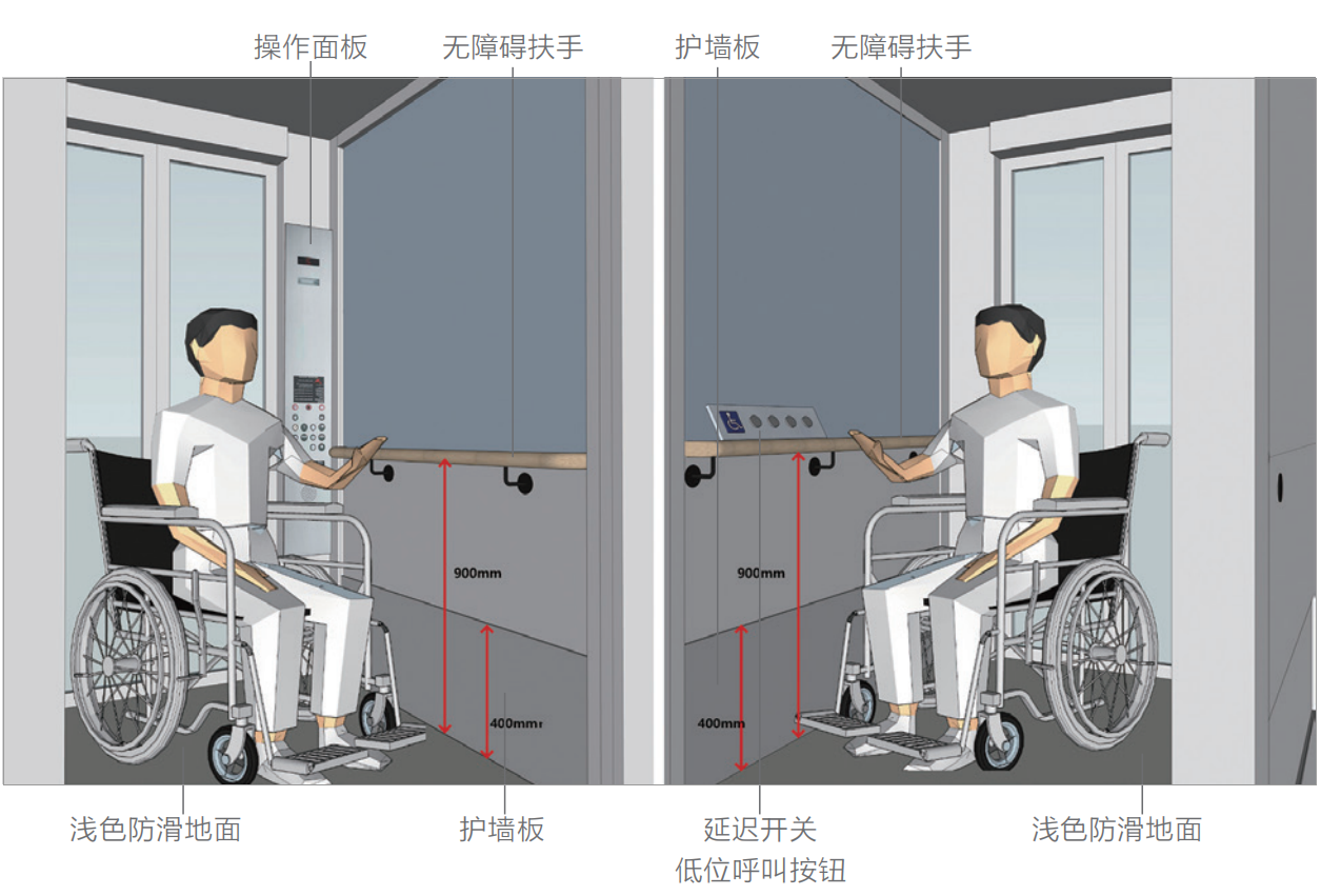 電梯門應(yīng)保持5~20s的開啟時間,除非使用者操作轎廂內(nèi)的轎門開關(guān)按鈕,確保人員安全通行時間。轎廂的三面壁上設(shè)高900mm扶手。轎廂內(nèi)部的設(shè)計(jì)與安裝要避免造成傷害,不存在尖角或凸出物。轎廂內(nèi)三面采用鏡面不銹鋼,可將轎廂環(huán)境盡收眼底。輪椅進(jìn)出時,能通過鏡面觀察周圍情況,進(jìn)退自如。
