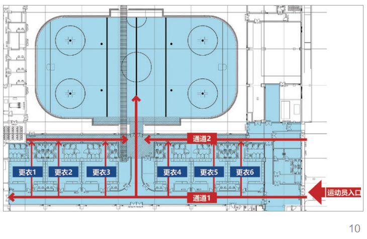 根據(jù)殘奧會冰球比賽的流程和運(yùn)動特征,運(yùn)動員需乘坐輪椅或使用義肢經(jīng)過鋪設(shè)有普通材質(zhì)地面的走廊到達(dá)更衣室,在更衣室內(nèi)更換冰橇后,前往檢錄處、場地和替補(bǔ)席,為了冰球運(yùn)動員乘坐冰橇的通行順暢,此部分走廊需要鋪設(shè)仿真冰面,以便冰橇滑行。因此,在運(yùn)動員更衣室前后設(shè)計(jì)雙側(cè)走廊。