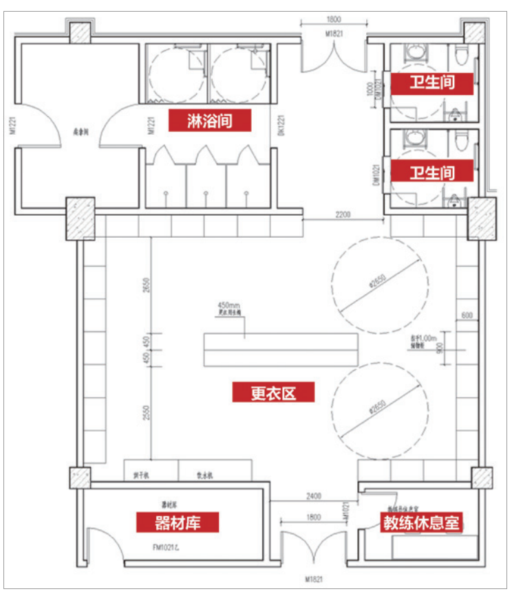 輪椅冰壺訓(xùn)練館無障礙運(yùn)動員休息室每間包括更衣區(qū)、無障礙衛(wèi)生間(2個單間)、無障礙淋浴間(2個隔間)及清潔間;更衣區(qū)內(nèi)部設(shè)有直徑2.60m的輪椅回轉(zhuǎn)空間。