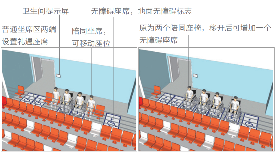 陪同坐席使用可移動座椅,不需要的時候可以移開,2個陪同坐席移開的寬度可以保證再加1個無障礙坐席,因此可根據(jù)現(xiàn)場人員使用情況靈活布置。