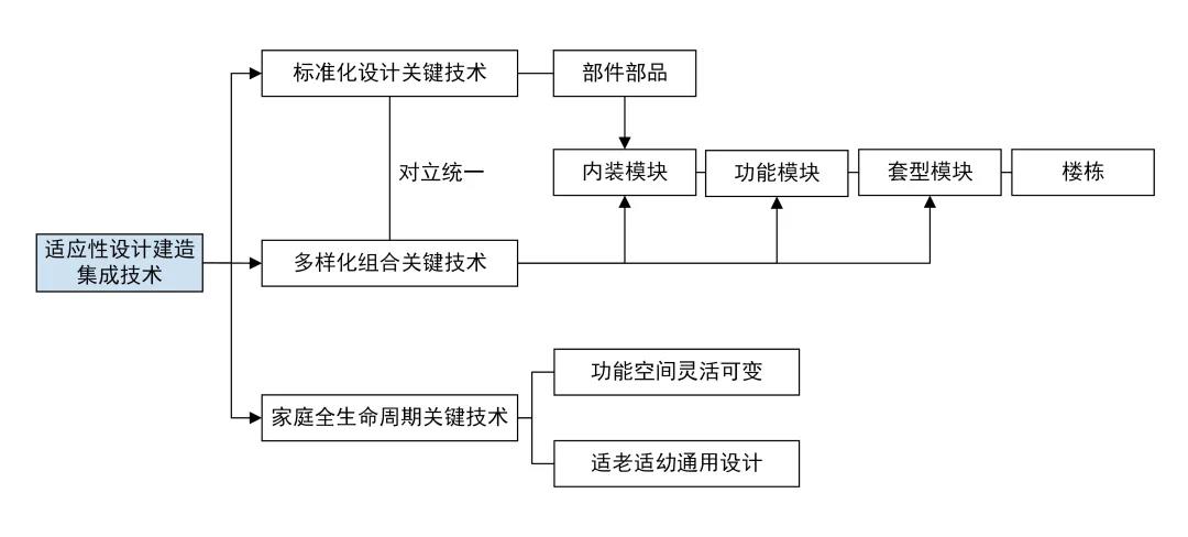 百年住宅適應性指在住宅主體結(jié)構(gòu)不變的前提下,套內(nèi)空間滿足多樣化家庭結(jié)構(gòu)和生活方式的需求,功能布局靈活,便于改造利用。百年住宅的適應性設(shè)計建造集成技術(shù)包括標準化設(shè)計關(guān)鍵技術(shù)、多樣化組合關(guān)鍵技術(shù)、家庭全生命周期關(guān)鍵技術(shù)等。百年住宅標準化設(shè)計采用標準化的部件部品形成標準化的內(nèi)裝模塊、功能模塊、套型模塊,在此基礎(chǔ)上進行不同的組合,形成多樣化的建筑成品,并結(jié)合未來居住可能性,進行適老化、適幼化套型研發(fā)。