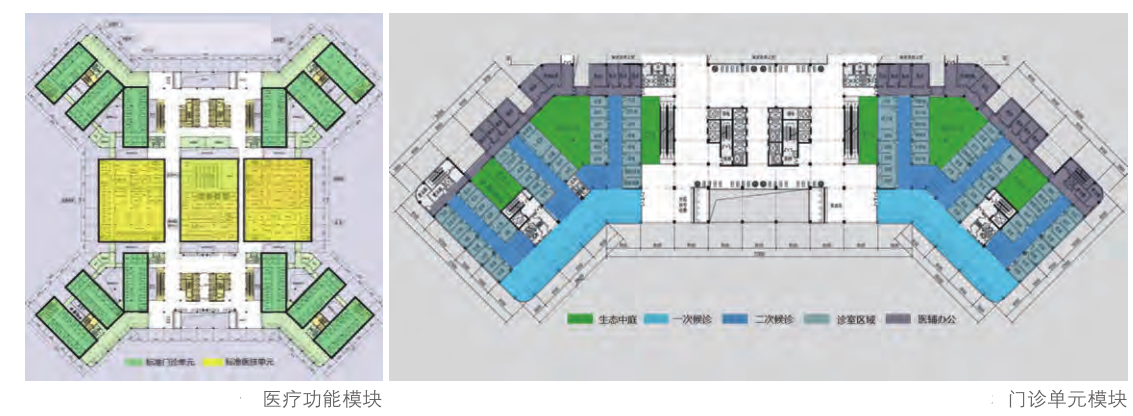 為了實(shí)現(xiàn)“會生長的醫(yī)院”,我們將“模塊化”的概念引入,設(shè)置了標(biāo)準(zhǔn)的門診單元及醫(yī)技單元。病房樓下側(cè)依次展開門診單元(每個(gè)單元的尺寸控制在12.4~29m),每層南北各設(shè)置6個(gè)模塊。模塊間設(shè)置景觀庭院及交通核,充分引入自然采光和通風(fēng);醫(yī)技模塊設(shè)置在中間位置。門診、醫(yī)技模塊之間通過連廊連接,聯(lián)系緊密。模塊化的設(shè)計(jì)增強(qiáng)了功能的替代性,能夠適應(yīng)科室的多元發(fā)展;模數(shù)化的柱網(wǎng)也增強(qiáng)了建筑的穩(wěn)定性與經(jīng)濟(jì)性。