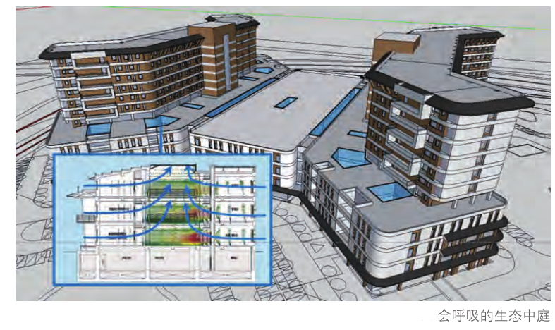 建筑通過生態(tài)中庭的穿插、組合,將室外的空氣和光線引入,形成多處通透、開放的灰空間,適應(yīng)氣候并調(diào)節(jié)環(huán)境。