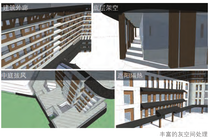建筑設(shè)置了大量的半室外灰空間。通過設(shè)置外廊、底層架空、中庭拔風(fēng)、立體綠化、遮陽隔熱構(gòu)件等處理,營造了涼爽舒適的微環(huán)境,同時(shí)也增強(qiáng)了建筑的立面層次。