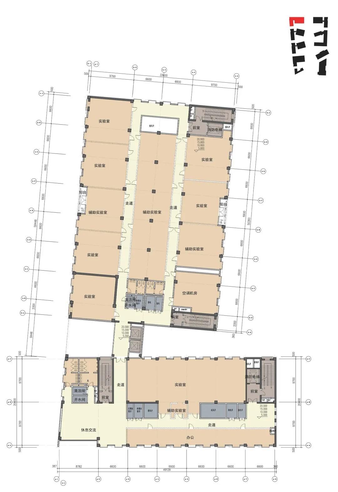 1#至5#樓平面布局均采用L形平面,短邊采用單走廊系統(tǒng),一側(cè)為實驗室,另一側(cè)為研究辦公室,整體進深20.4米,每層建筑面積約950~1200平米;長邊采用雙走廊系統(tǒng),設環(huán)形走道,兩側(cè)布置實驗室,中間布置輔助實驗室,整體進深33.6米,每層建筑面積約1400~1700平方米。