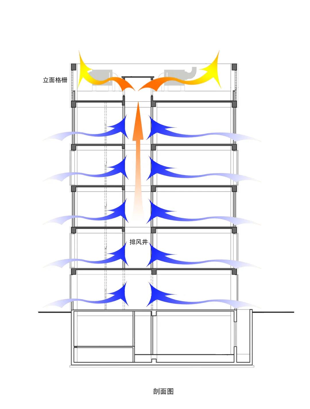 本項目每層預留的進風井面積約15~17㎡,排風井面積約25~32㎡。屋面預留了大量的風機基礎。為了保證建筑立面效果,四周外墻向上升高約4.5m,側(cè)面設置大面積百葉,用于遮擋屋面風機。