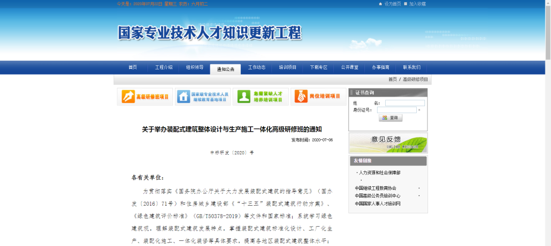 2020年5月14日,人力資源社會保障部辦公廳印發(fā)《專業(yè)技術(shù)人才知識更新工程2020年高級研修項目計劃的通知》(人社廳發(fā)〔2020〕53號),中國建設(shè)科技集團(tuán)申報的“裝配式建筑整體設(shè)計與生產(chǎn)施工一體化”高級研修班獲批立項,研修經(jīng)費由人力資源和社會保障部全額資助,中國建筑標(biāo)準(zhǔn)設(shè)計研究院為承辦單位。