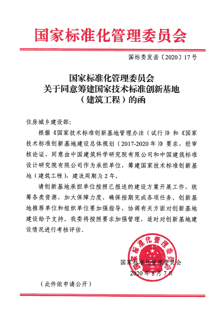 2020年8月,中國建筑標(biāo)準(zhǔn)設(shè)計(jì)研究院有限公司獲批國家技術(shù)標(biāo)準(zhǔn)創(chuàng)新基地(建筑工程)承擔(dān)單位。該基地是我國建筑工程領(lǐng)域技術(shù)標(biāo)準(zhǔn)國家級(jí)平臺(tái),也是住房城鄉(xiāng)建設(shè)領(lǐng)域唯一的國家技術(shù)標(biāo)準(zhǔn)創(chuàng)新基地,旨在通過技術(shù)創(chuàng)新、標(biāo)準(zhǔn)制定、平臺(tái)孵化等方式助推中國建筑工程領(lǐng)域發(fā)展。