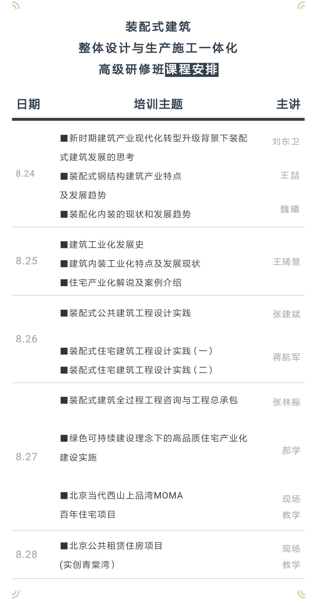 2020年8月24日-8月28日,由中國建設(shè)科技集團(tuán)申報、中國建筑標(biāo)準(zhǔn)設(shè)計研究院承辦的人社部裝配式建筑整體設(shè)計與生產(chǎn)施工一體化高級研修班在北京成功舉辦。