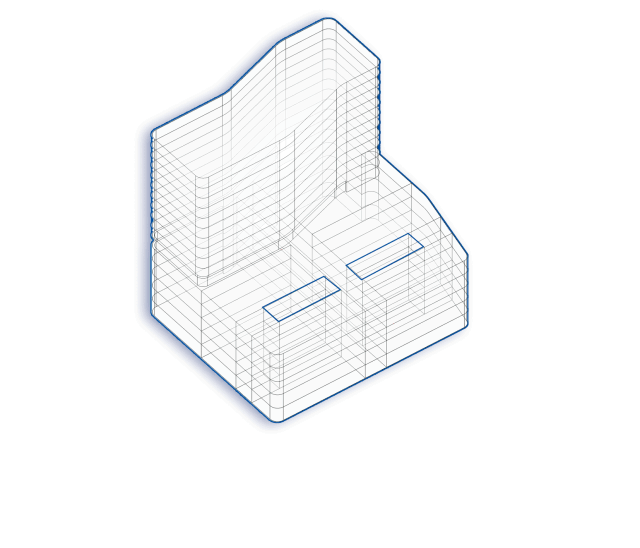 裙房中部設(shè)置醫(yī)療主街,東西布置模塊化醫(yī)療單元,單元之間嵌入庭院;東南角布置急診模塊;北側(cè)布置醫(yī)技模塊;南側(cè)布置門診模塊;上部布置護(hù)理單元模塊;護(hù)理單元模塊與醫(yī)技模塊間布置設(shè)備層。