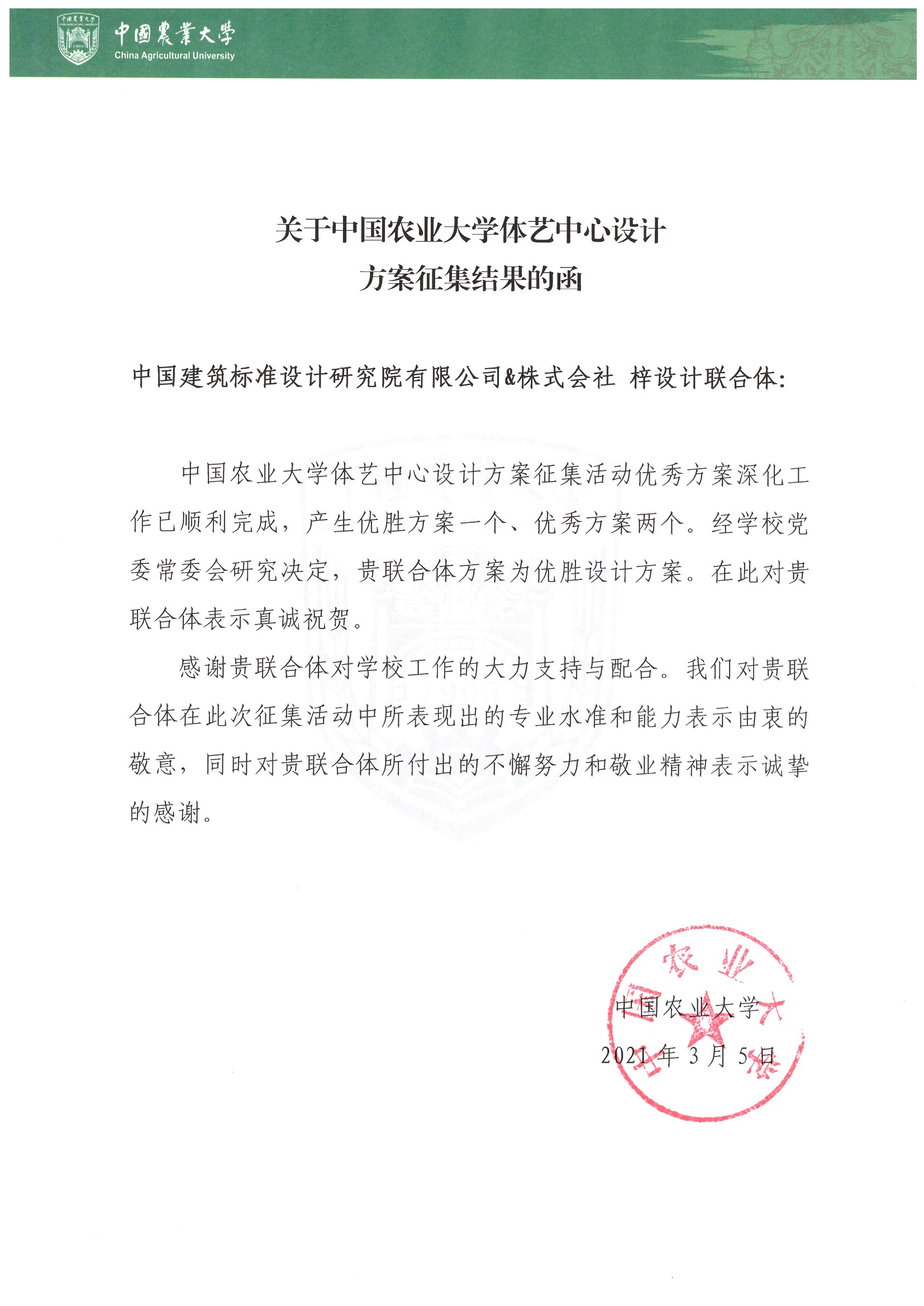 由中國(guó)建筑標(biāo)準(zhǔn)設(shè)計(jì)研究院有限公司(以下簡(jiǎn)稱“標(biāo)準(zhǔn)院”)和株式會(huì)社梓設(shè)計(jì)(日)于2020年聯(lián)合參與的中國(guó)農(nóng)業(yè)大學(xué)體藝中心設(shè)計(jì)方案征集競(jìng)賽終于落下帷幕,在與其余7家設(shè)計(jì)單位競(jìng)選的國(guó)際競(jìng)賽中以第一名的優(yōu)勢(shì)脫穎而出,并經(jīng)過近半年的方案優(yōu)化調(diào)整,于三家入圍單位中拔得頭籌,被中國(guó)農(nóng)業(yè)大學(xué)選為優(yōu)勝方案。