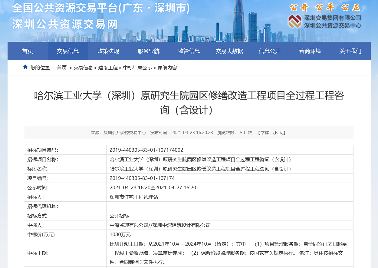 2021年4月23日,中國建筑標準設計研究院有限公司(以下簡稱“標準院”)子公司——深圳中深建筑設計有限公司(以下簡稱“深圳中深”),聯(lián)合中海監(jiān)理投標的“哈爾濱工業(yè)大學(深圳)原研究生院園區(qū)修繕改造工程項目全過程工程咨詢(含設計)”經(jīng)評標委員會專家(八名)對最后入圍的三家單位投票表決后,最終脫穎而出成功中標。本項目是深圳中深入選深圳市第一批全過程工程咨詢試點企業(yè)后,在深圳首次中標的全過程工程咨詢項目,同時也是工務署全咨含設計(方案、初設)的試點項目。深圳中深在深圳本土項目承接中邁出了堅實步伐,為標準院在粵港澳大灣區(qū)全過程工程咨詢業(yè)務拉開了序幕。