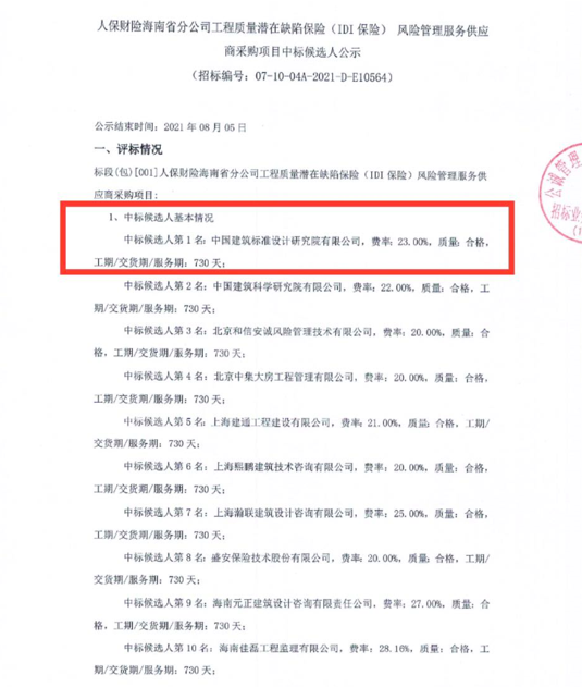2021年8月5日,人保財(cái)險(xiǎn)海南省分公司IDI保險(xiǎn)的風(fēng)險(xiǎn)管理服務(wù)商采購項(xiàng)目中標(biāo)候選人結(jié)果正式公布,標(biāo)準(zhǔn)院建筑產(chǎn)品應(yīng)用技術(shù)研究院在該采購項(xiàng)目所有中標(biāo)候選人中名列第一名!