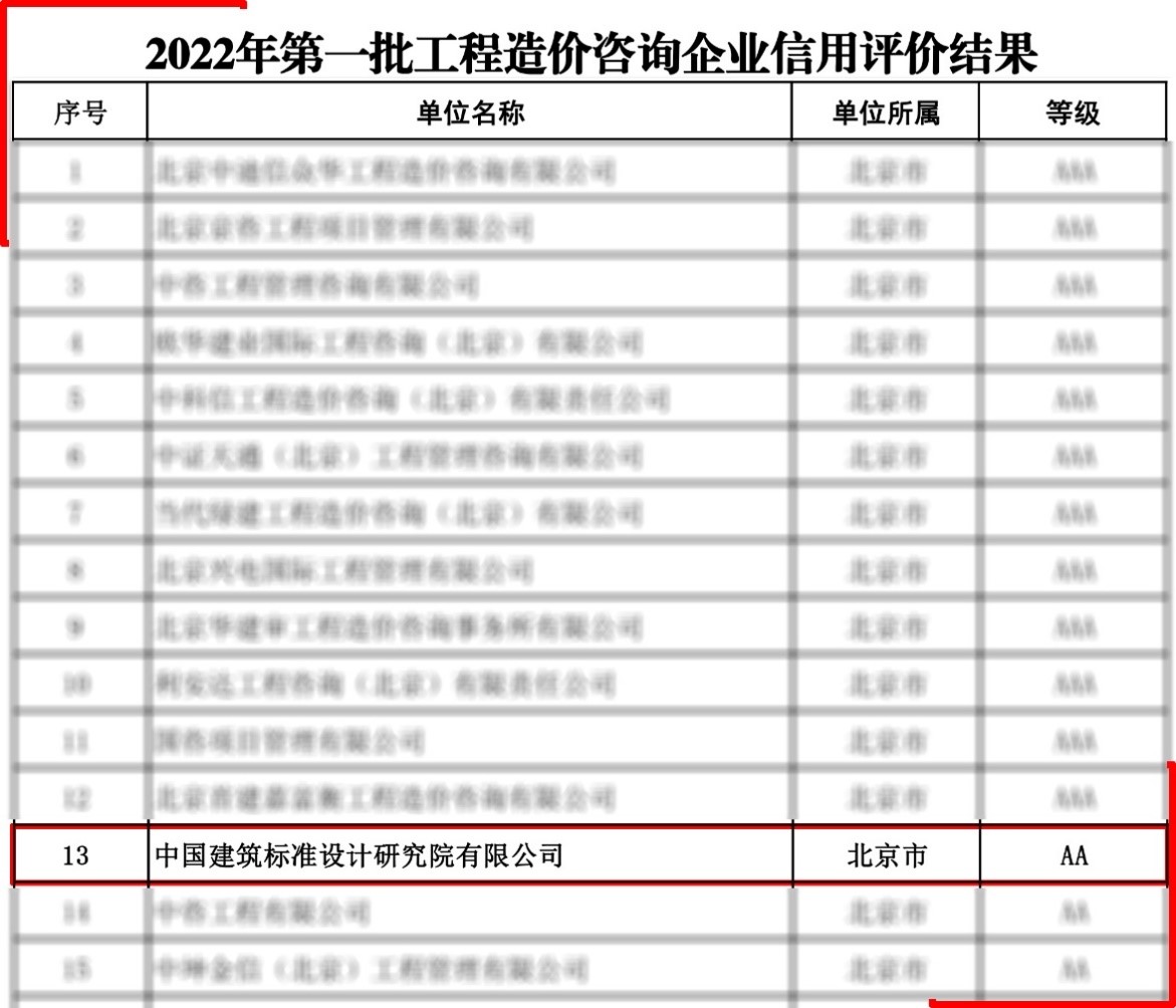 經(jīng)企業(yè)申報(bào)、各省級(jí)工程造價(jià)行業(yè)協(xié)會(huì)(中價(jià)協(xié)專業(yè)工作委員會(huì))初評(píng),中價(jià)協(xié)組織專家終評(píng)等程序,對(duì)評(píng)價(jià)結(jié)果予以公布,標(biāo)準(zhǔn)院被評(píng)為AA級(jí)企業(yè)信用等級(jí)。