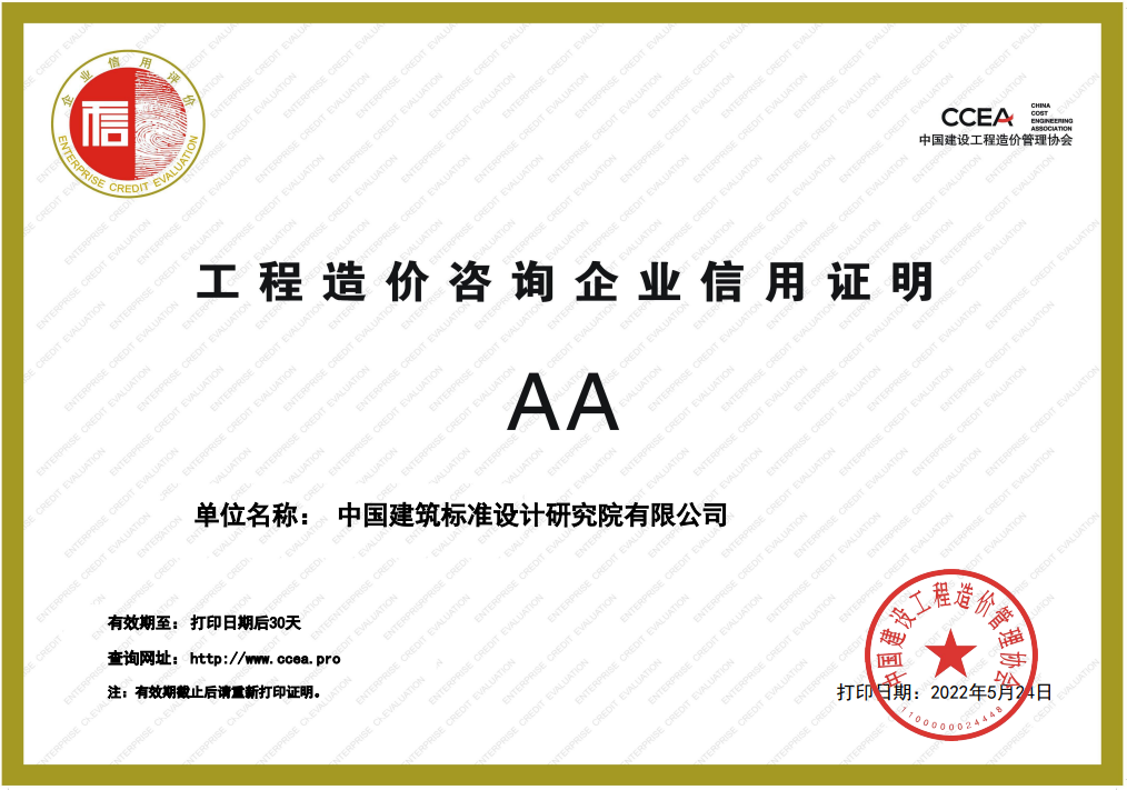 日前,中國(guó)建筑標(biāo)準(zhǔn)設(shè)計(jì)研究院有限公司(以下簡(jiǎn)稱“標(biāo)準(zhǔn)院”)獲評(píng)中國(guó)建設(shè)工程造價(jià)管理協(xié)會(huì)AA級(jí)造價(jià)咨詢企業(yè)信用等級(jí)。