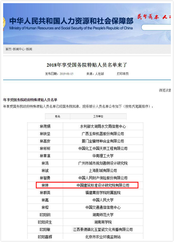近日,人社部發(fā)布了《人力資源社會保障部關于公布2018年享受政府特殊津貼人員名單的通知》(人社部發(fā)﹝2019﹞11號),經(jīng)國務院批準,中國建筑標準設計研究院副總建筑師林琳入選2018年度享受 ...