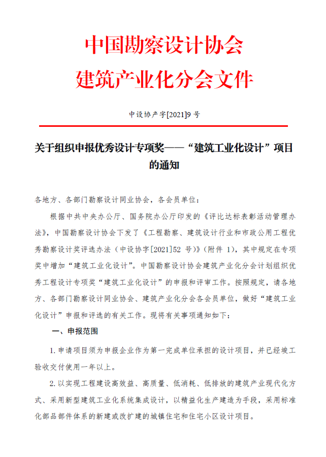 關(guān)于組織申報(bào)中國(guó)勘察設(shè)計(jì)協(xié)會(huì)優(yōu)秀設(shè)計(jì)專項(xiàng)獎(jiǎng)——“建筑工業(yè)化設(shè)計(jì)”項(xiàng)目的